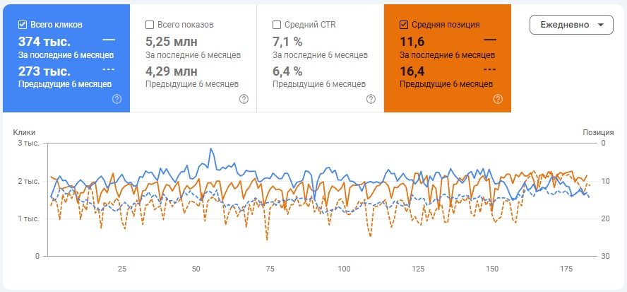 Уже после старта работ наблюдался стабильный рост переходов на сайт и повышение средней позиции, в частности благодаря обновлению структуры сайта: